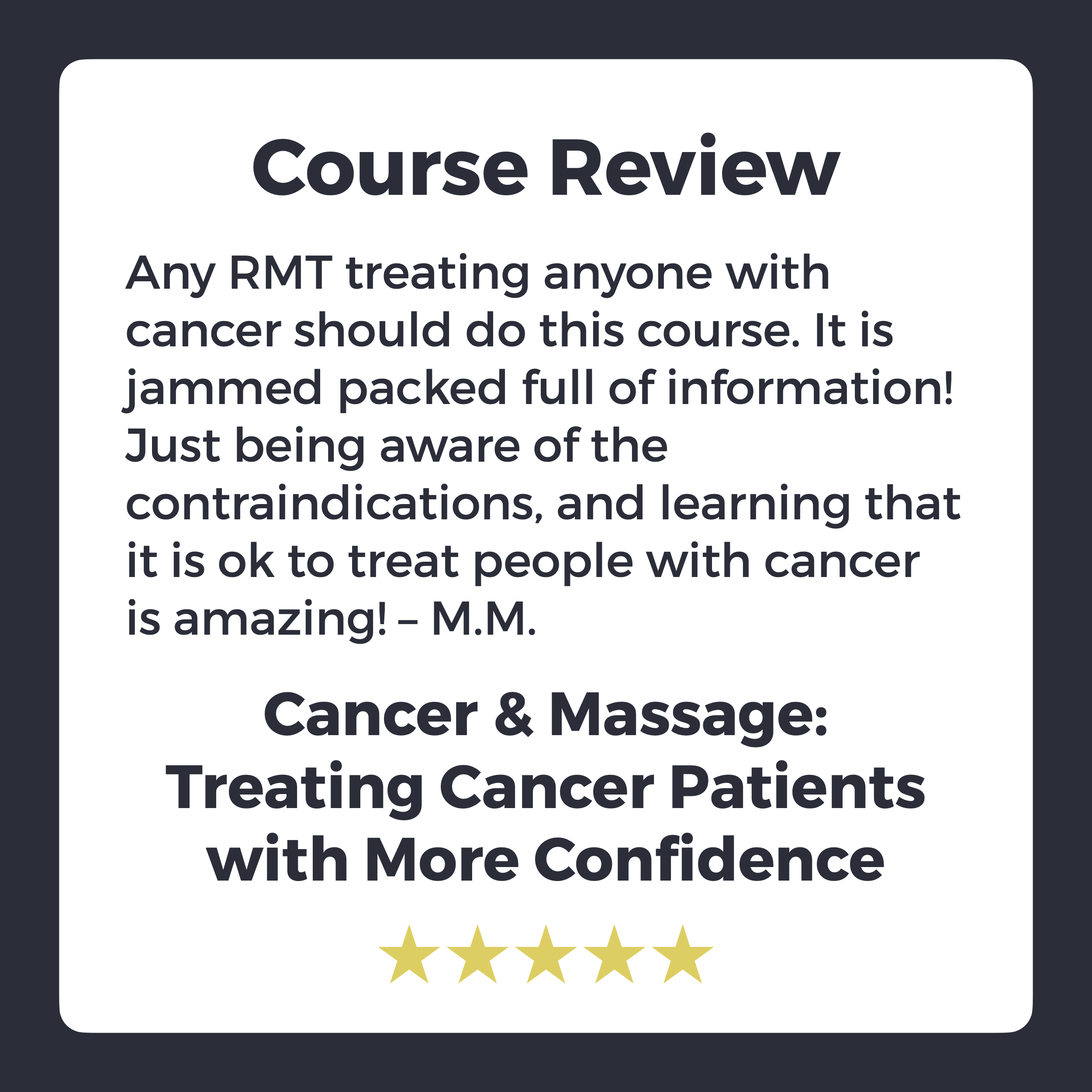 Cancer has always been a topic of interest to me because my mother was diagnosed with Colon Cancer when I was a teenager. I know that therapeutic massage was an integral part of her journey to recovery. This is one of the reasons why I created the course: “Cancer and Massage: Treating Cancer Patients with More Confidence”. We review what the causes and symptoms of cancer are, the different types of medical treatment, and the massage indications/contraindications.